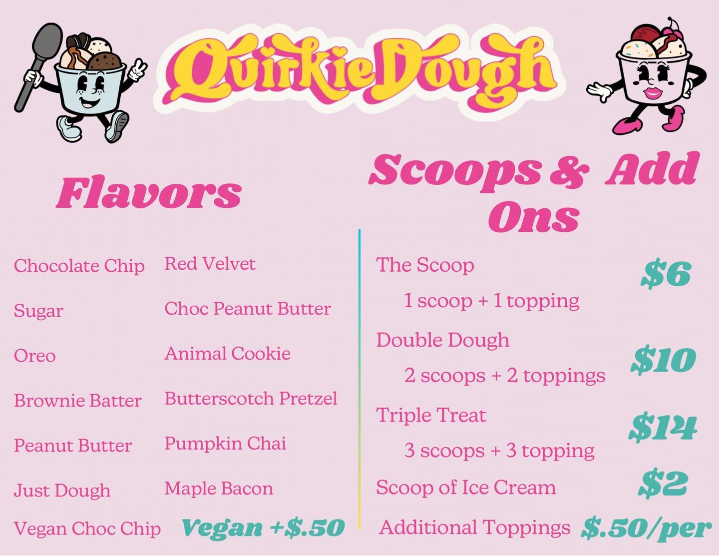 Bright, bold, and 100% safe to eat. Quirkie Dough serves up edible cookie dough in a variety of rotating and classic flavors. Come taste what everyone’s smiling about!